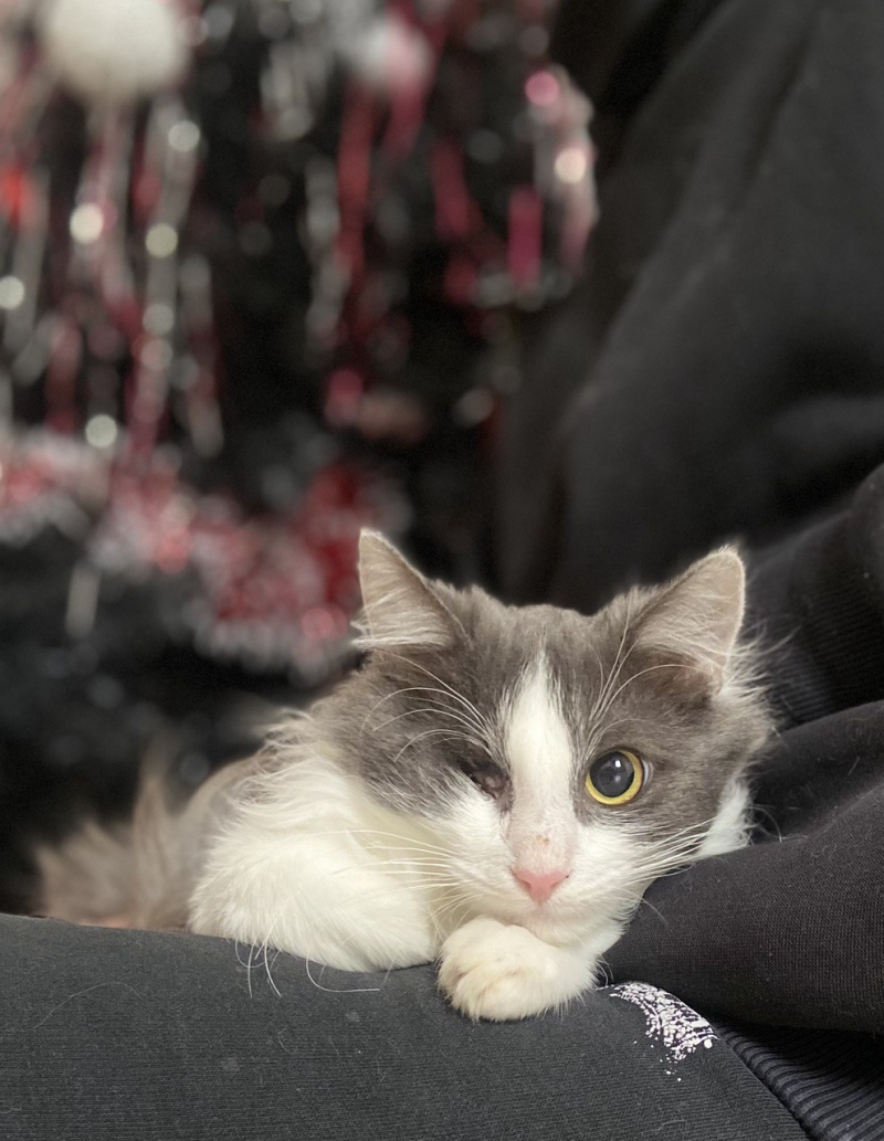 Котята рожденные на улицах, часто теряют зрение. Механические травмы, злые собаки, и результат — травмированный малыш. У Джо отсутствует один глаз. К сожалению, когда мы его нашли, спасти глазик было невозможно.