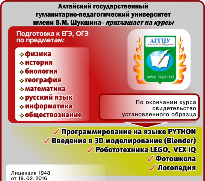 АГГПУ им. В. М. ШУКШИНА набирает школьников на курсы подготовки к ЕГЭ и ОГЭ по всем предметам. Качество работы преподавателей гарантируем. Лицензия.