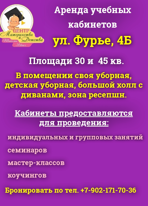 Кабинеты предоставляются для проведения:• индивидуальных и групповых занятий• семинаров• мастер-классов• коучинговТарифыИндивидуальные занятия• 60 мин. 300 руб.• 180 мин 500 руб.• День ПН/СР/ПТ 2000 руб.• День СБ/ВС/ПРАЗДНИЧНЫЙ ДЕНЬ 1500 руб.Групповые занятия 2-4 чел.• 60 мин. 400 руб.• 180 мин. 700 руб.• День ПН/СР/ПТ 2500 руб.• День СБ/ВС/ПРАЗДНИЧНЫЙ ДЕНЬ 2000 руб.Групповые занятия 5-12 чел.• 60 мин. 600 руб.• 180 мин. 1000 руб.• День ПН/СР/ПТ 5000 руб.• День СБ/ВС/ПРАЗДНИЧНЫЙ ДЕНЬ 3500 руб.